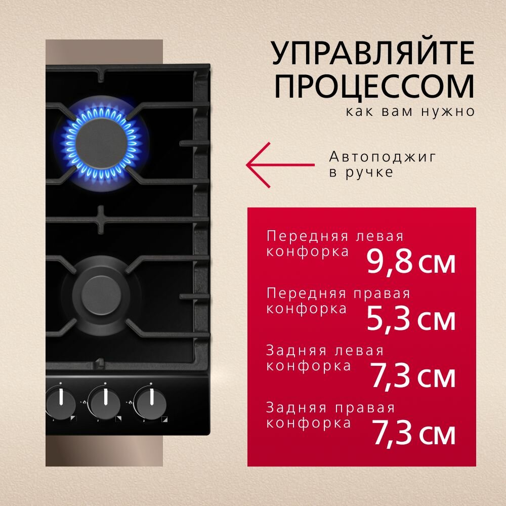 | Размеры конфорок | передняя левая конфорка 9,8 см, задняя левая конфорка 7,3 см, передняя правая конфорка 5,3 см, задняя правая конфорка 7,3 см |