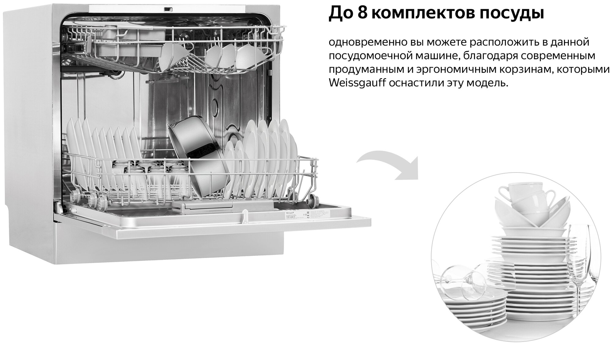 Настольная посудомоечная машина Weissgauff TDW 4006 S З года гарантии, 8 комплектов, 7 программ, Электронное управление, Быстрая мойка 30 мин, Индикация работы, Таймер, Дозагрузка посуды