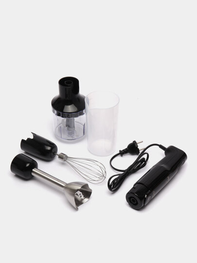 Насадка погружного блендера очень хорошо измельчает, её можно помещать в любую ёмкость, а не только в мерный стакан, он кстате идет в комплекте, так же как и веничек для взбивания, и компактный измельчитель – чаша не большая но функциональная, подойдет для измельчения овощей, мяса предварительно порезанных на небольшие кусочки. |