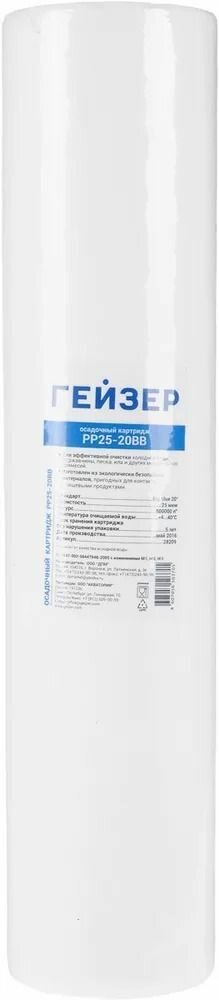 Картридж полипропиленовый Гейзер PP 25 - 20 ВВ, ресурс 800 000 л, для холодной воды, очистка воды от ржавчины, грязи, песка и других примесей, 28209