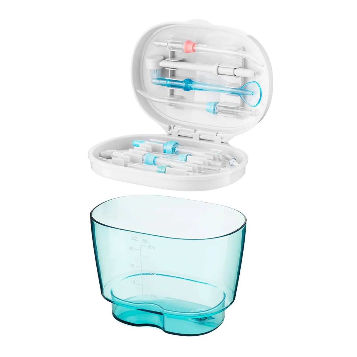 -Большое количество насадок: есть классические, от налетан, для чистки языка, для ортодонтических конструкций, щётка; -Вместительный объём, хватает на одну чистку зубов; -Удобный контейнер для хранения насадок; - Присоски для устойчивости аппарата. |