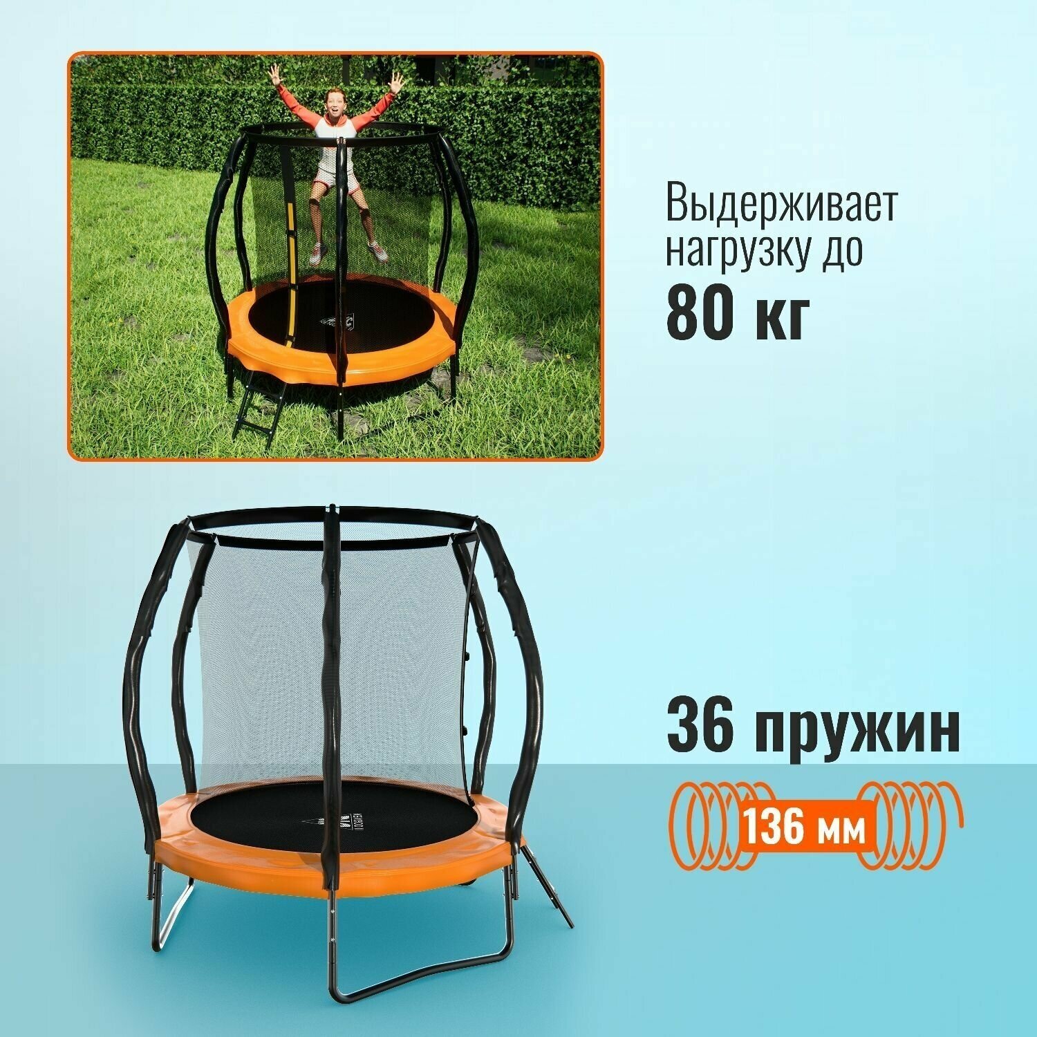 Батут DFC KENGOO II 6ft внутр.сетка, лестница, оранж/черн (183см)