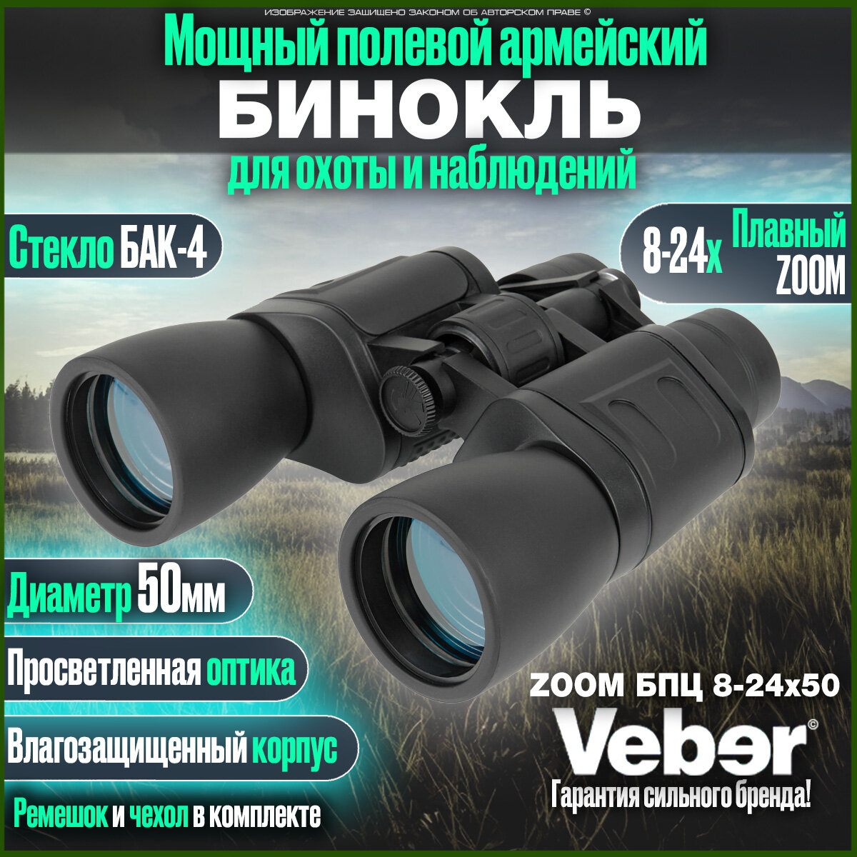 Мощный оптический армейский полевой бинокль для охоты, рыбалки, туризма и наблюдений Veber ZOOM БПЦ 8-24x50