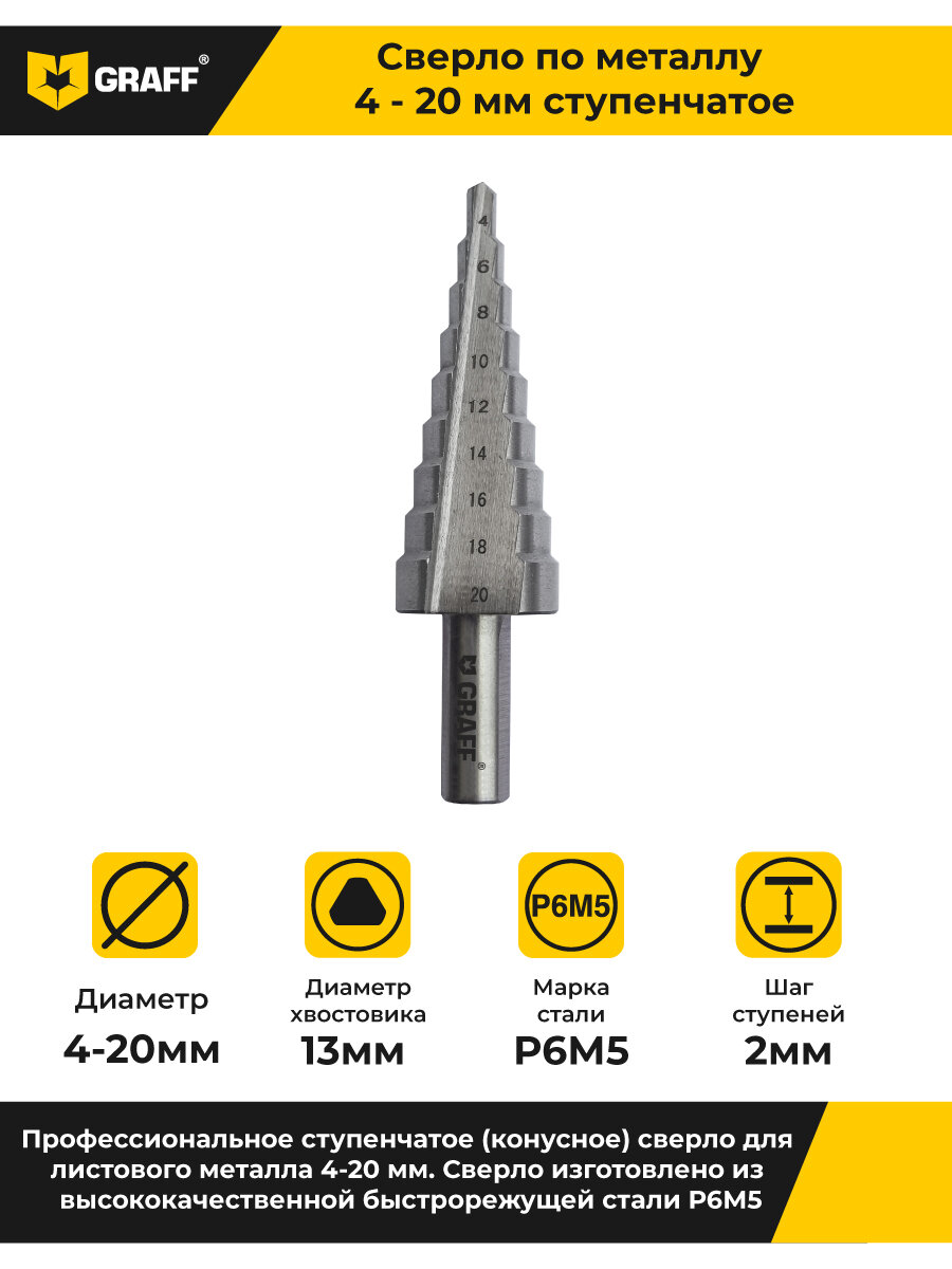 GRAFF Сверло ступенчатое по металлу (4-20 мм; Р6М5; блистер) GRAFF GMSD420 / 70420