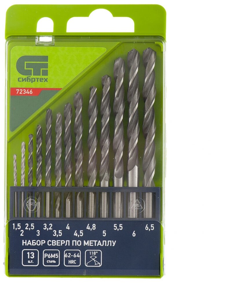 Набор сверл по металлу СИБРТЕХ 72346, 1.5 - 6.5 мм, 13 шт., Р6М5, пластиковый кейс