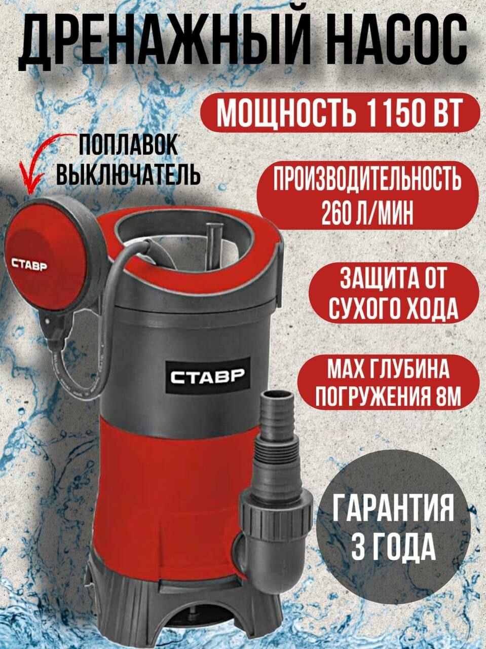 Насос погружной дренажный Ставр НПД-1150, 1150 Вт, макс производительность 260 л/мин