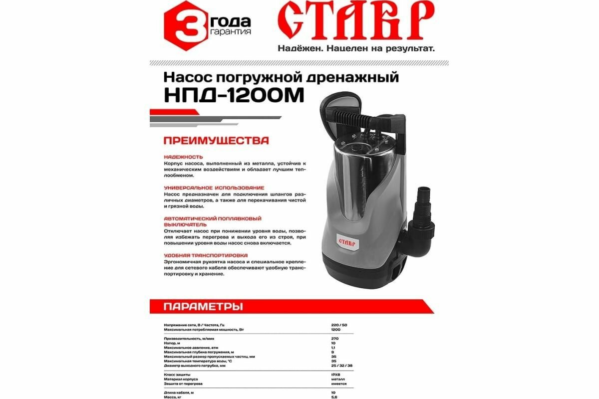 Дренажный насос Ставр НПД-1200М, погружной, мощность 1200Вт, автоматический поплавковый выключатель