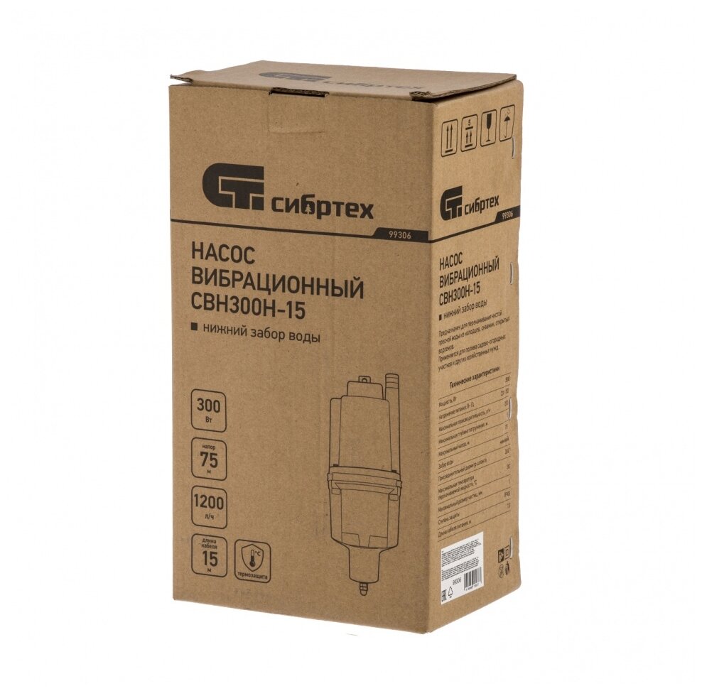 Вибрационный насос СВН300Н-15, нижний забор, 300 Вт, напор 75 м, 1200 л/ч, кабель 15 м Сибртех, арт. 99306