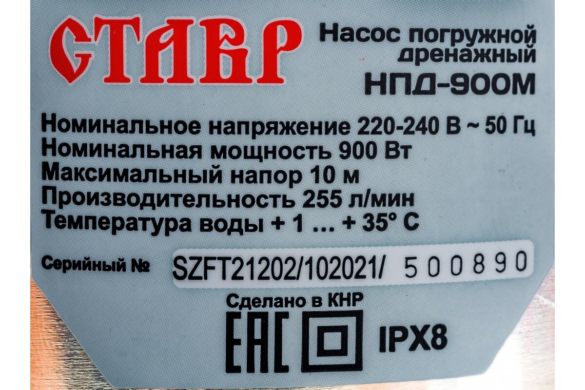 Ставр НПД-900М Насос погружной дренажный 900Вт, максимальная производительность 255л/мин