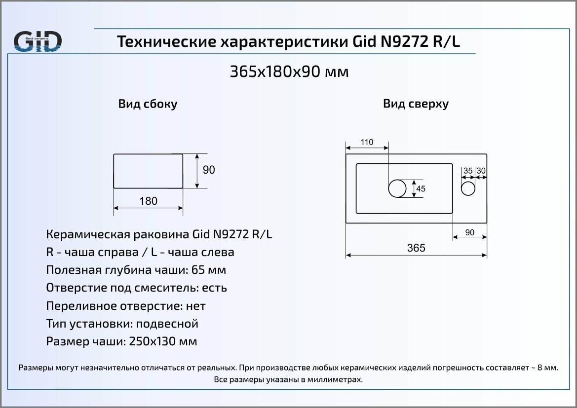 Подвесная раковина 36.5x18х9см Gid N9272R чаша справа