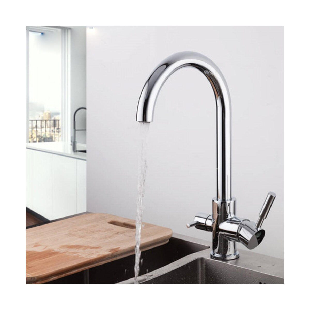 | Плюсы: | Два рычага для открывания воды, большой гусь, удобный монтаж. |