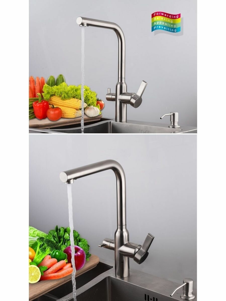 Кран под фильтр, за 7тр вообще нет аналогово приличных. Практичный внешний вид, вода нигде не скапливается, все стекает (как часто есть площадка на соединении трубки излива со смесителем. Где и копится вода и грязь) В комплекте есть кольцо для установки и на столешницу из лдсп. С резиновым уплотнителем. Высший уровень продуманности. На борт бойки можно ставить без него. Будет более минималистичный внешний вид. и на каменные и пластиковые столешки. |