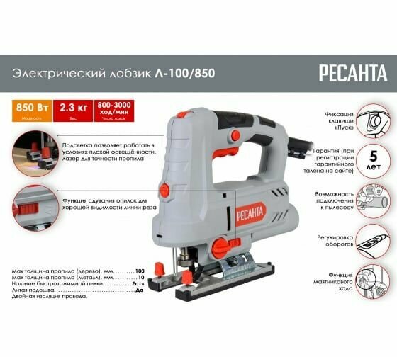 1 Лобзик сетевой, 850 Вт, 3000 ход/мин, глубина реза 100 мм, РЕСАНТА Л-100/850 75/9/4