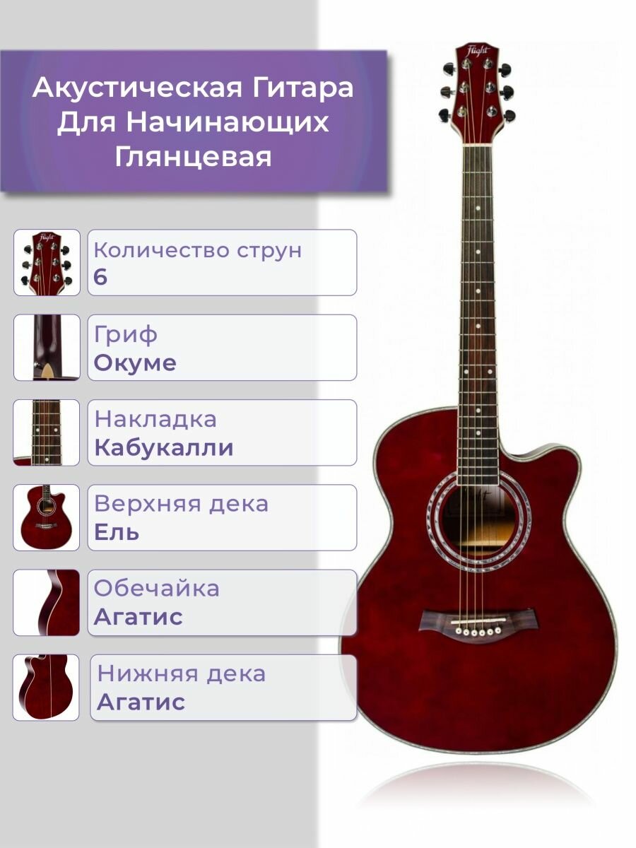 Гитара акустическая FLIGHT F-230C WR - фолк гитара с металлическими струнами, верхняя дека - ель, корпус - агатис, цвет красное вино, 39", с вырезом DNT-19655