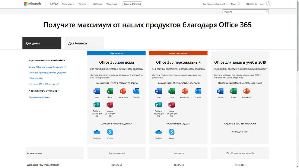 супер предложение если вам нужен офис для нескольких человек, тут можно целых 6 человек задействовать и у каждого будет возможность на 5 своих устройств установить, OneDrive 1TB облачного хранилища для каждого пользователя отдельный отлично!!!! почта Outlook лучший почтовый ящик который я встречал, безопасный, не приходит тупой спам!!! классический подбор приложений офиса word excel powerpoint, а еще access и publisher. и стоит еще добавить про Skype 60 минут каждый месяц!!