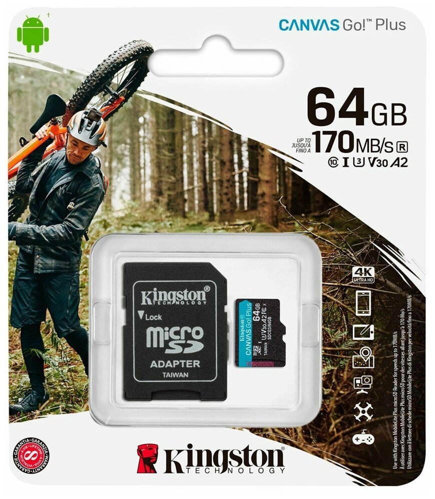 Карта памяти micro sd 64gb Kingston Class 10 Canvas Go Plus (SDCG3/64GB) UHS-I U3 V30 A2 170/70 Мб/с + SD адаптер