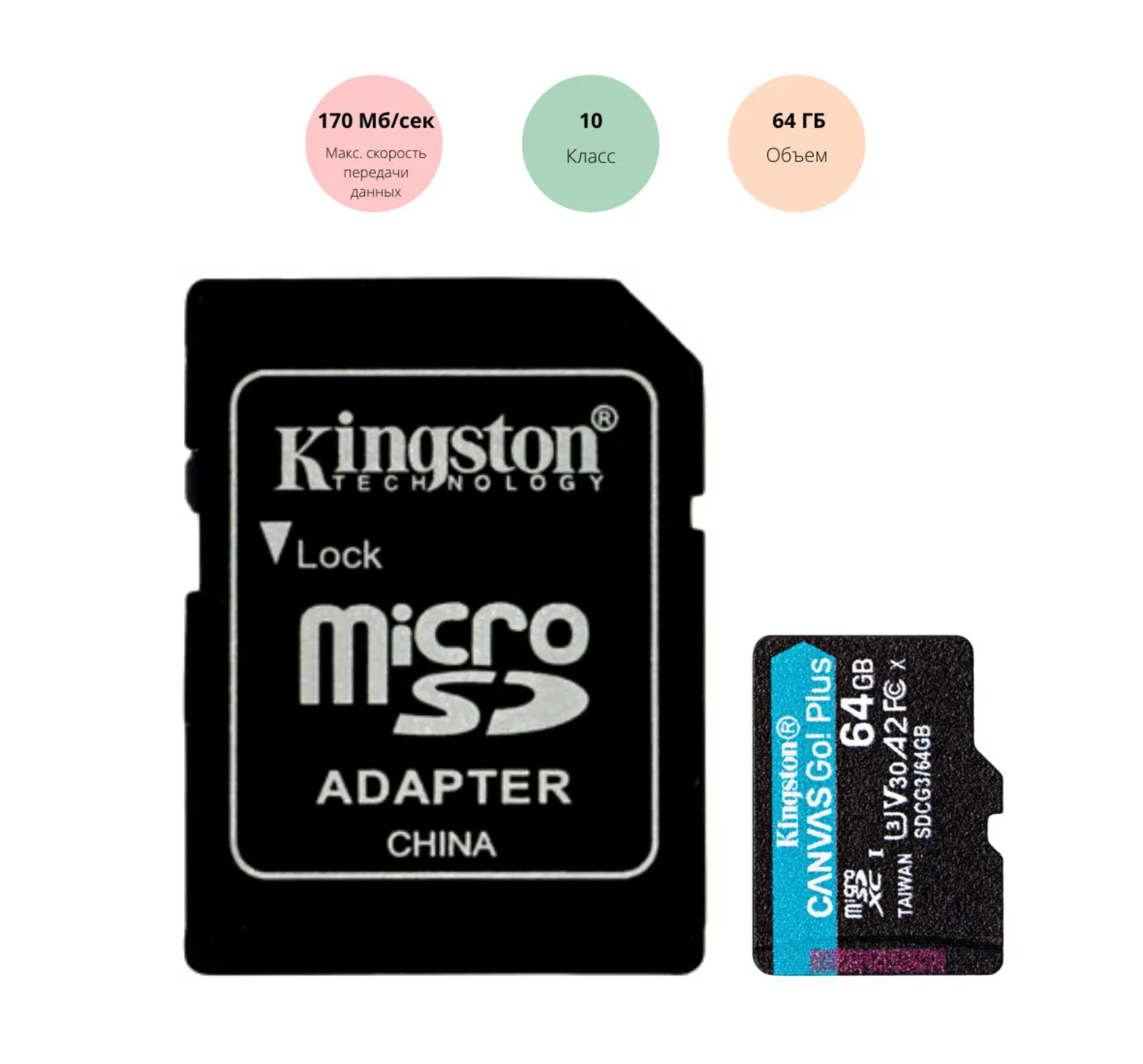 Карта памяти Kingston Canvas Go! Plus microSDXC UHS-I Cl10 +ад, SDCG3/64Gb, 1 шт.