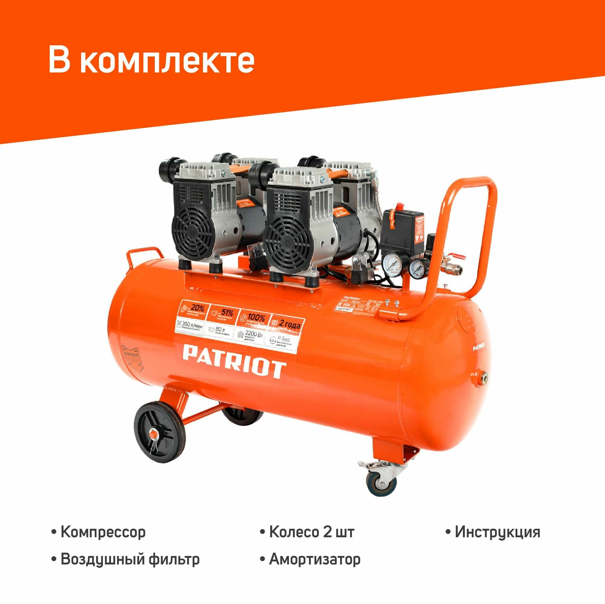 Компрессор поршневой безмасляный Patriot WO 80-360, 2200 Вт