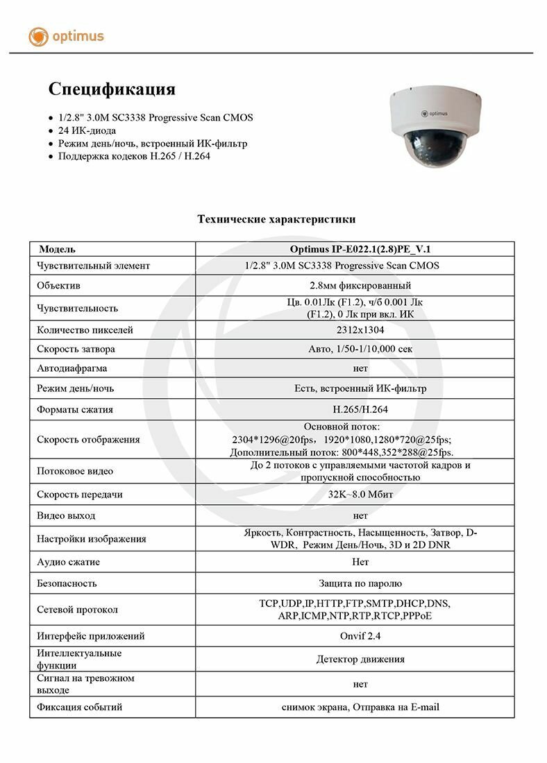 Видеокамера optimus ip-e022.1(2.8)pe_v.1 В0000013623