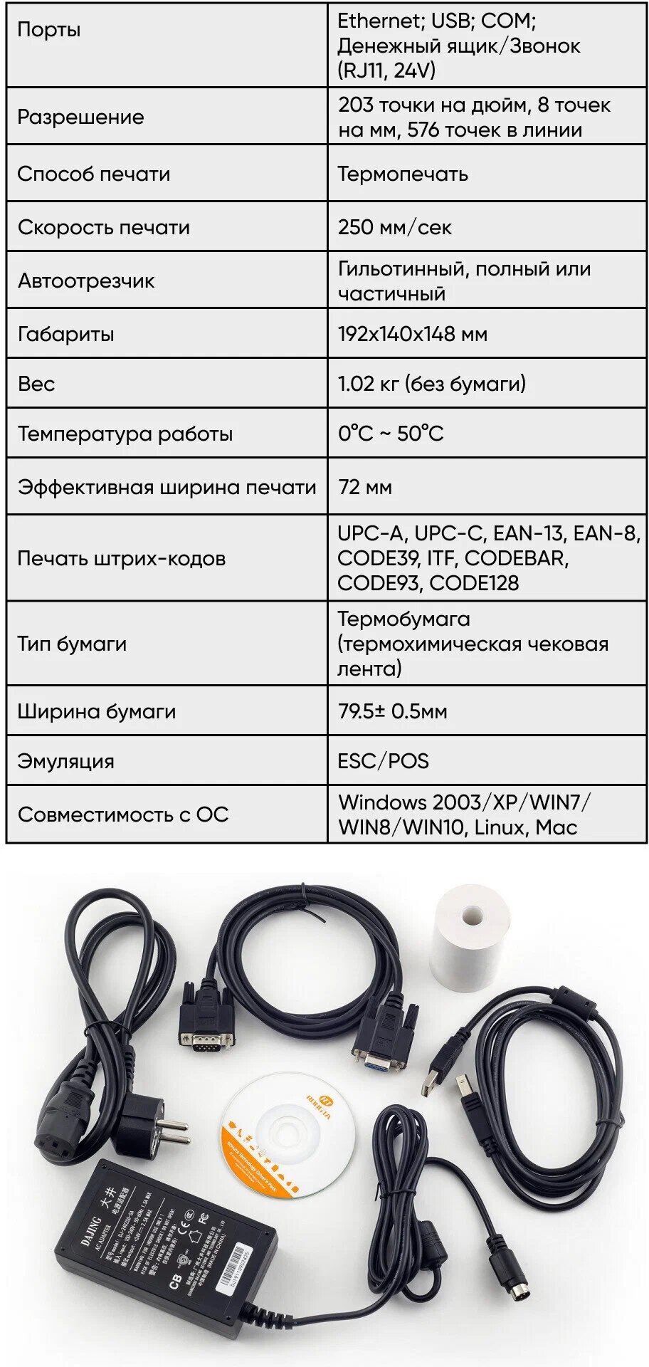 | Комплектация | Сам принтер, блок питания, интерфейсный кабель (USB или COM), Руководство пользователя. |