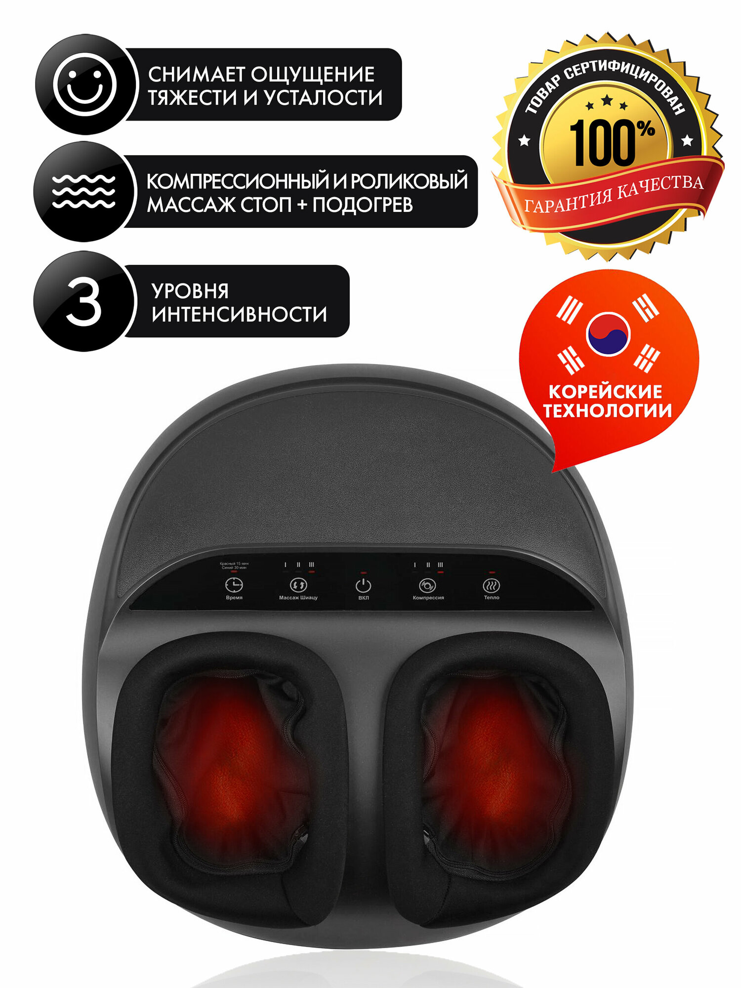 не тяжелый, легко переносить в руках; - 3 уровня компрессии и 3 программы массажа Шиацу; подойдет для любого размера ног (регулируется степенью компрессии); - съемные чехлы для стирки (на молнии+внутри липучки); - инструкция и меню на русском языке, розетка адаптированна, без всяких переходников. |