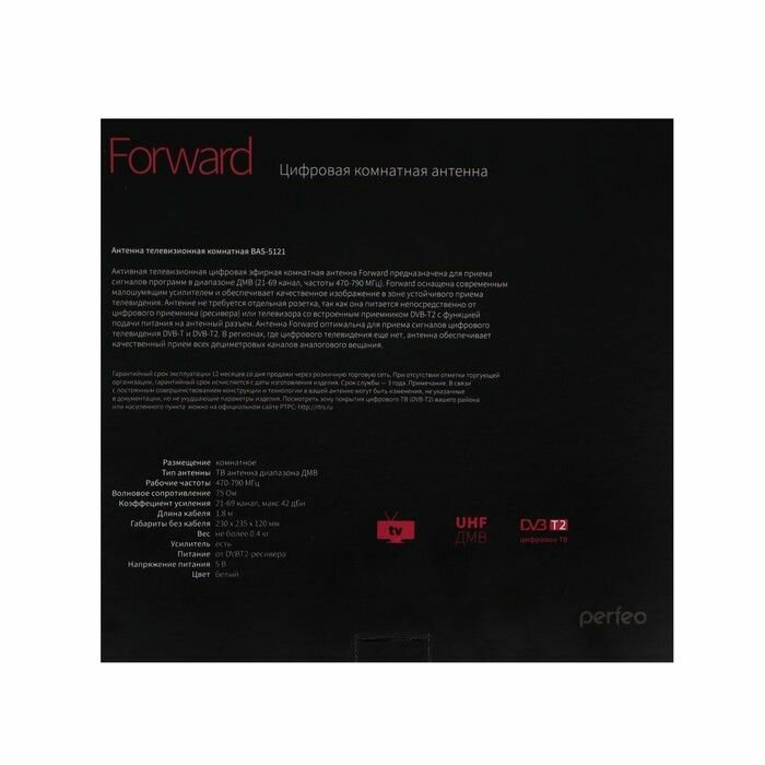 Купить Perfeo ТВ антенна "FORWARD", активная, встр. усилитель, питание от ресивера 5V, DVB-T2 [PF_A4209]