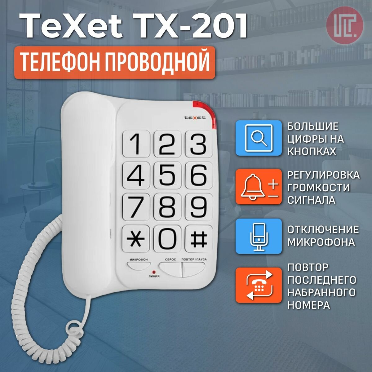 Телефон проводной teXet ТХ-201, повторный набор, крупные клавиши, белый ( Артикул 337858 )