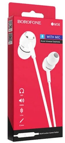 Гарнитура BOROFONE BM36 Acura 3.5 мм, внутриканальная, 1.2м (белый)
