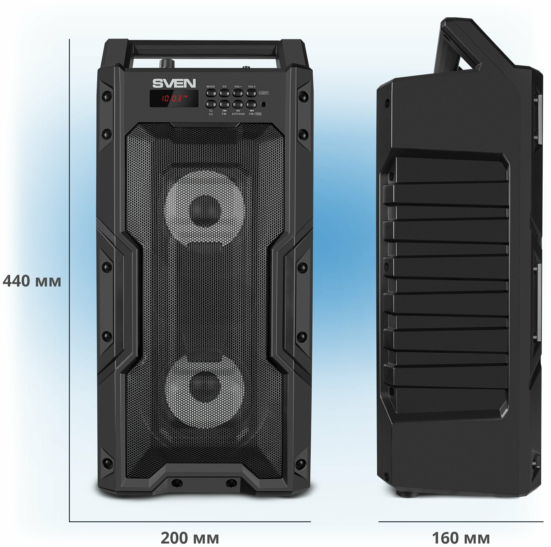 Колонка портативная беспроводная bluetooth SVEN PS-435, переносная с радио и ручкой для переноски / Колонка блютуз музыкальная акустическая с подсветкой / 20 Вт / TWS / USB / microSD / LED-дисплей / пульт / вход для караоке микрофона