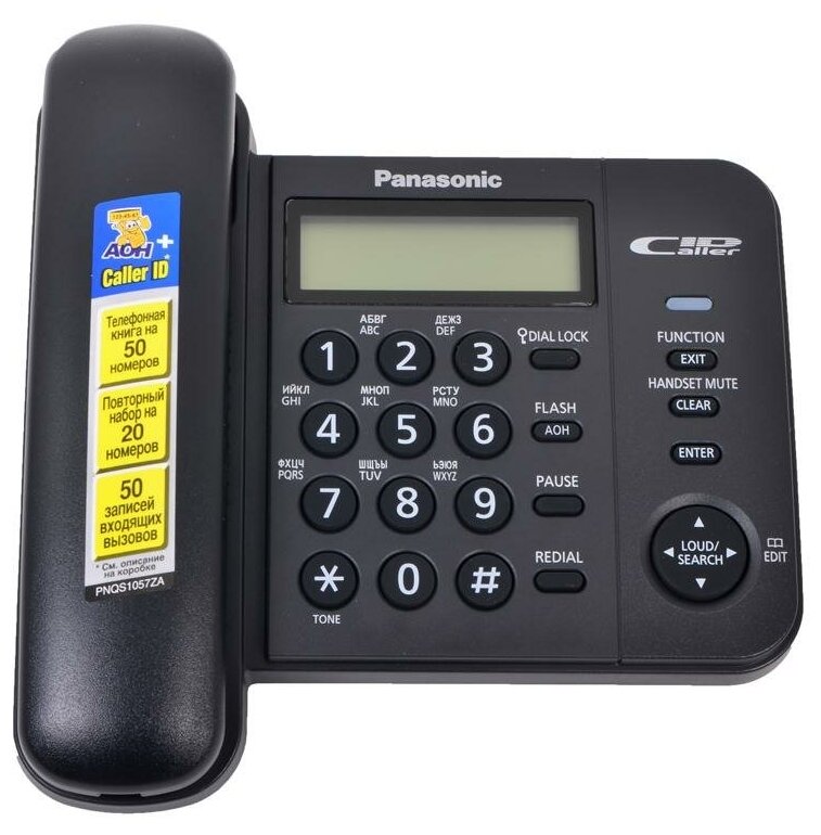 Телефон PANASONIC KX-TS2356RUB, черный, память 50 номеров, АОН, ЖК-дисплей с часами, тональный/импульсный режим