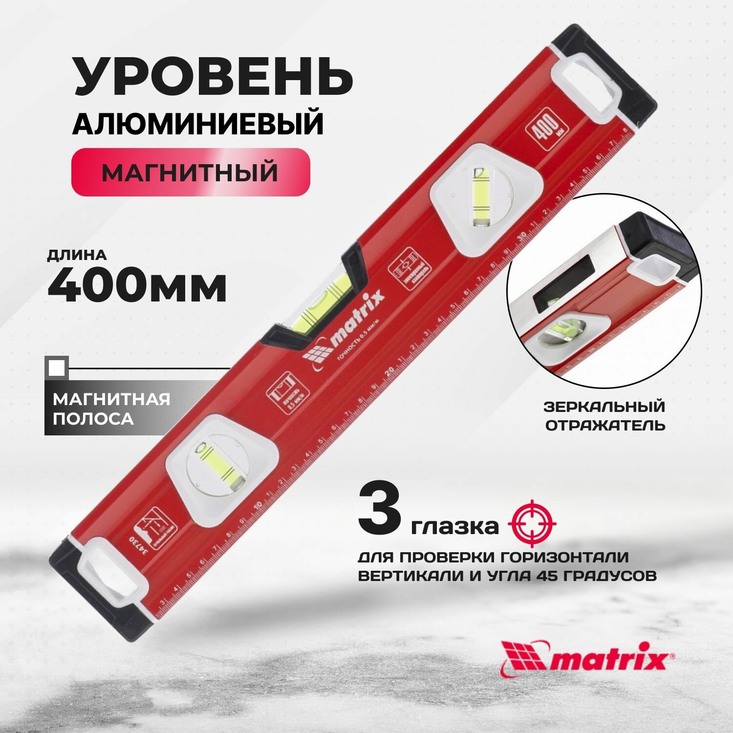 Уровень алюминиевый, магнит., фрезерованный, 3 глазка (1 зеркал.), 400 мм// Matrix