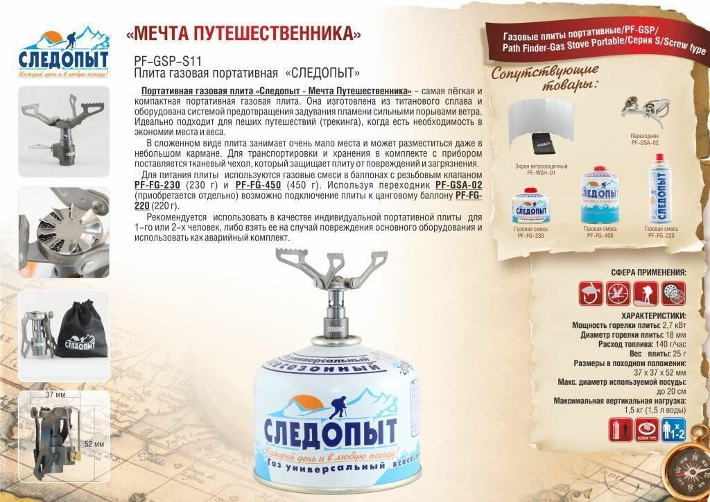 Плита портативная газовая Следопыт мечта путешественника 25 гр титановая, PF-GSP-S11