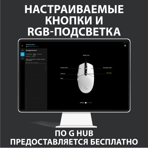 | Отзыв: | Так же на ПК можно установить специальное приложение Logitech G HUB, с помощью него можно управлять подсветкой, есть несколько режимов, можно поменять чувствительность мыши, и назначение кнопок. |