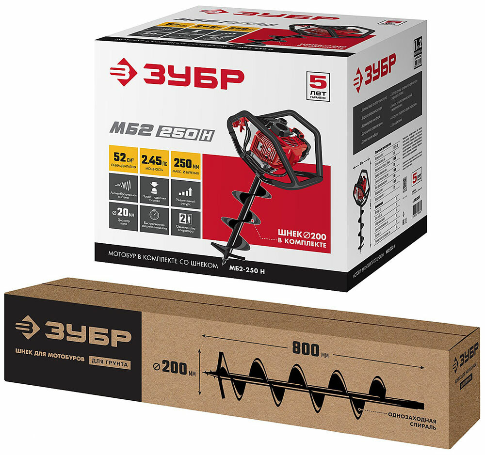 Мотобур (бензобур) Зубр МБ2-250 Н, со шнеком, d=60-250 мм, 52 см3, 2 оператора