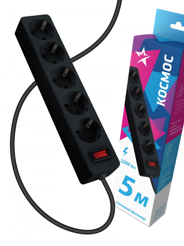 Сетевой фильтр Космос 5 м 5 розеток пвс 3х0 75мм2 черный