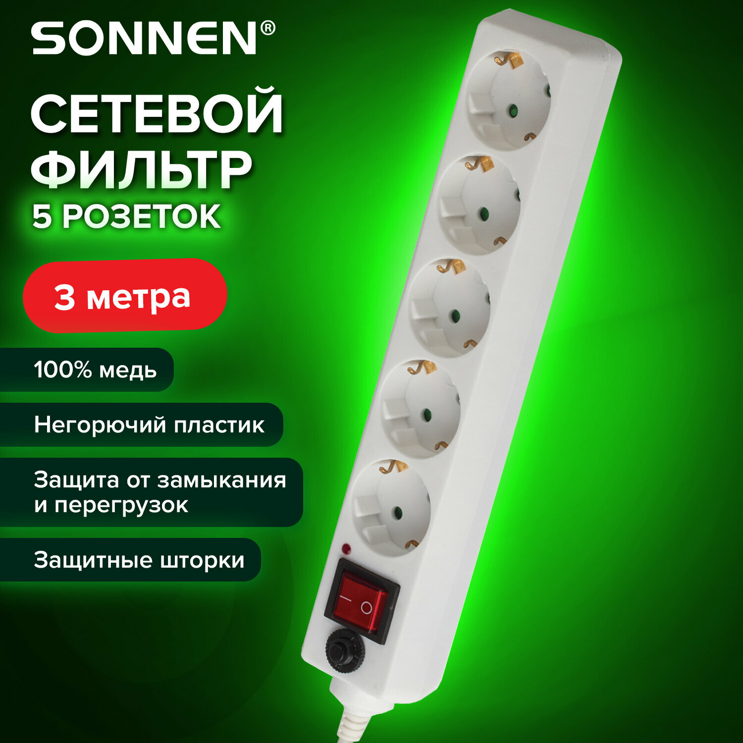 Сетевой фильтр SONNEN U-353, 5 розеток, с заземлением, выключатель, защита от перегрузок, 2,8 кВт, 10 А, 3 м