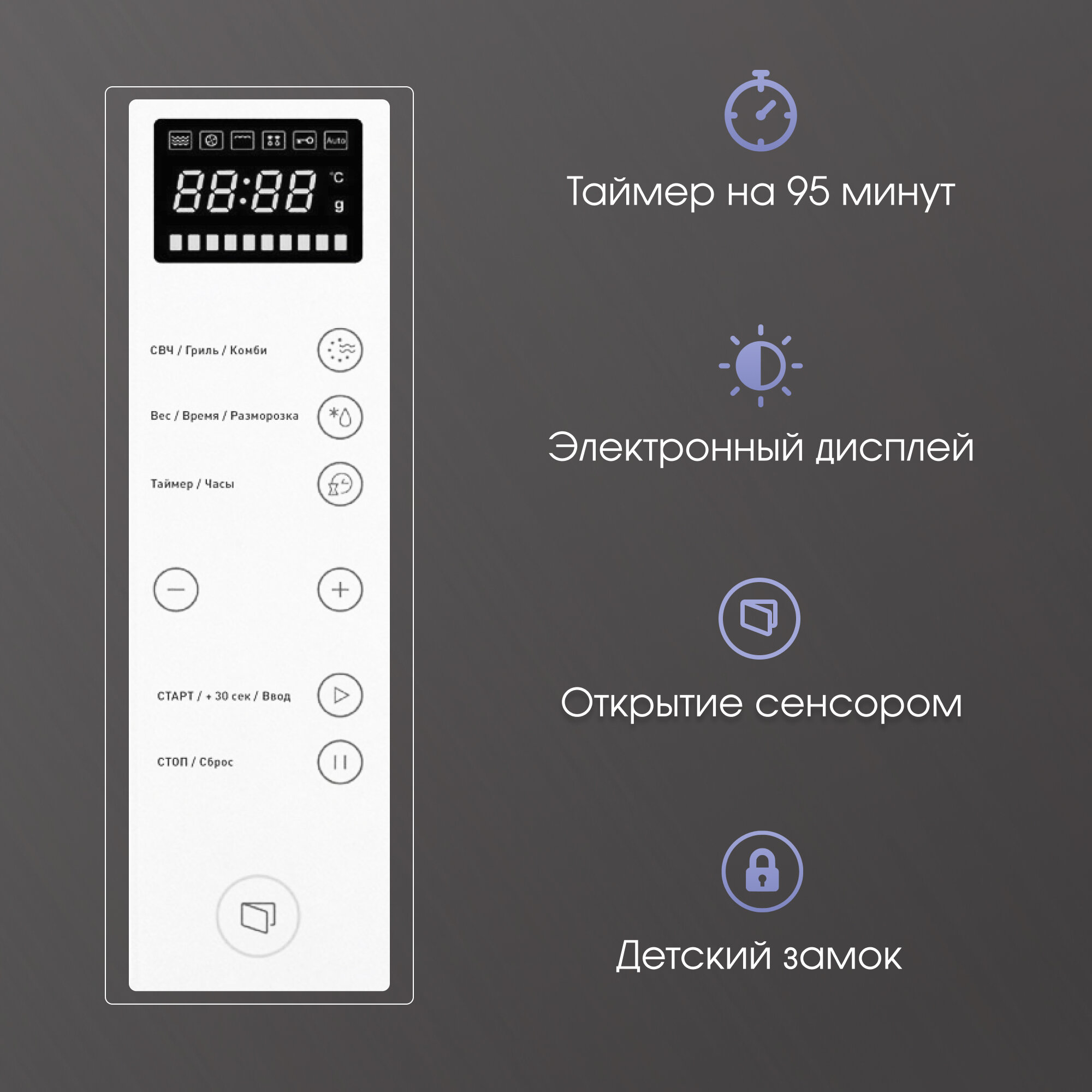| Режимы работы | гриль / микроволны + гриль / разморозка |