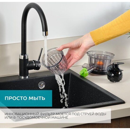 | Плюсы: | Отжимает на низкой скорости, тритановый фильтр, не большой размер. |