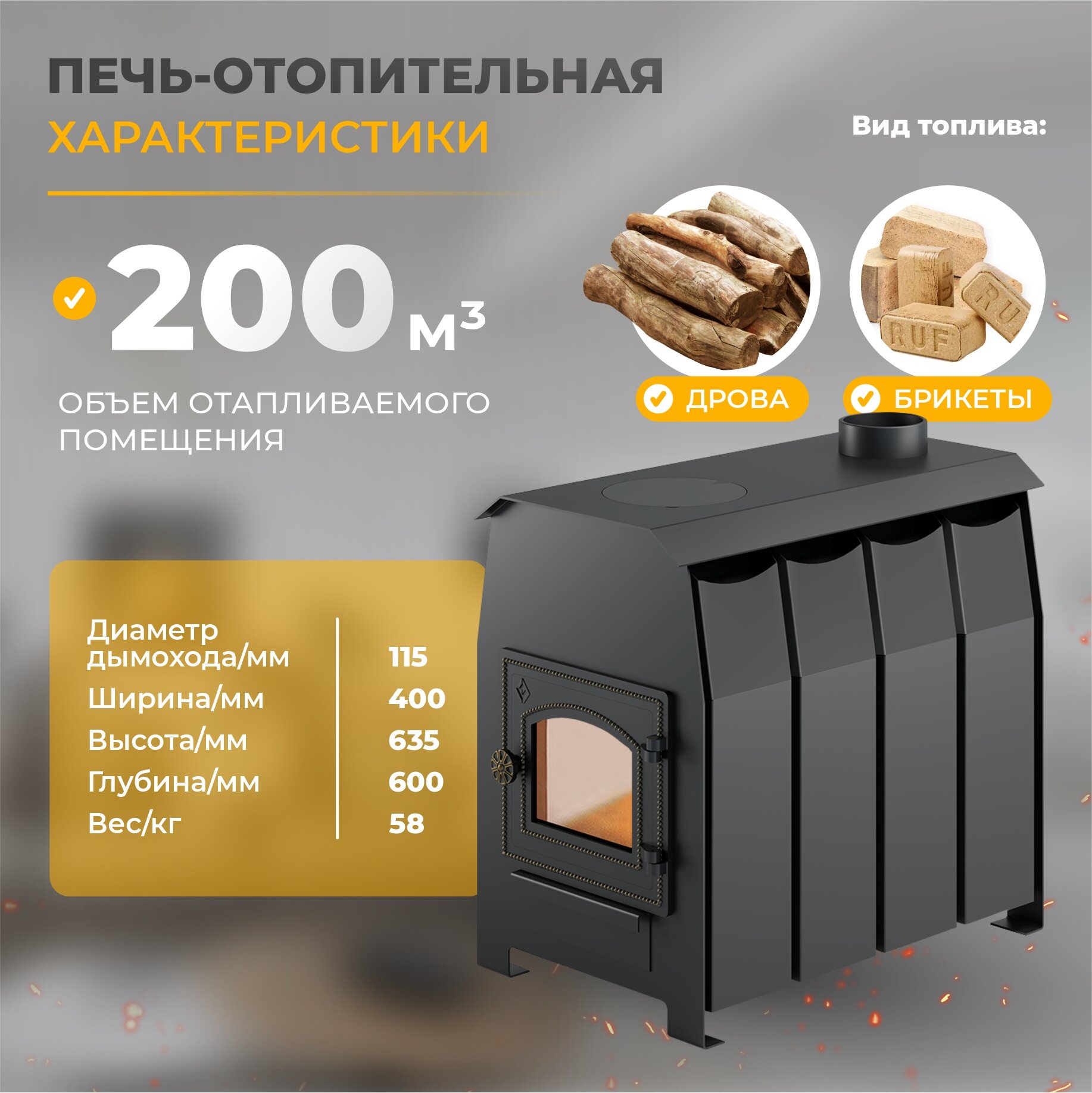 | Отапливаемый объем | 200 м³ |