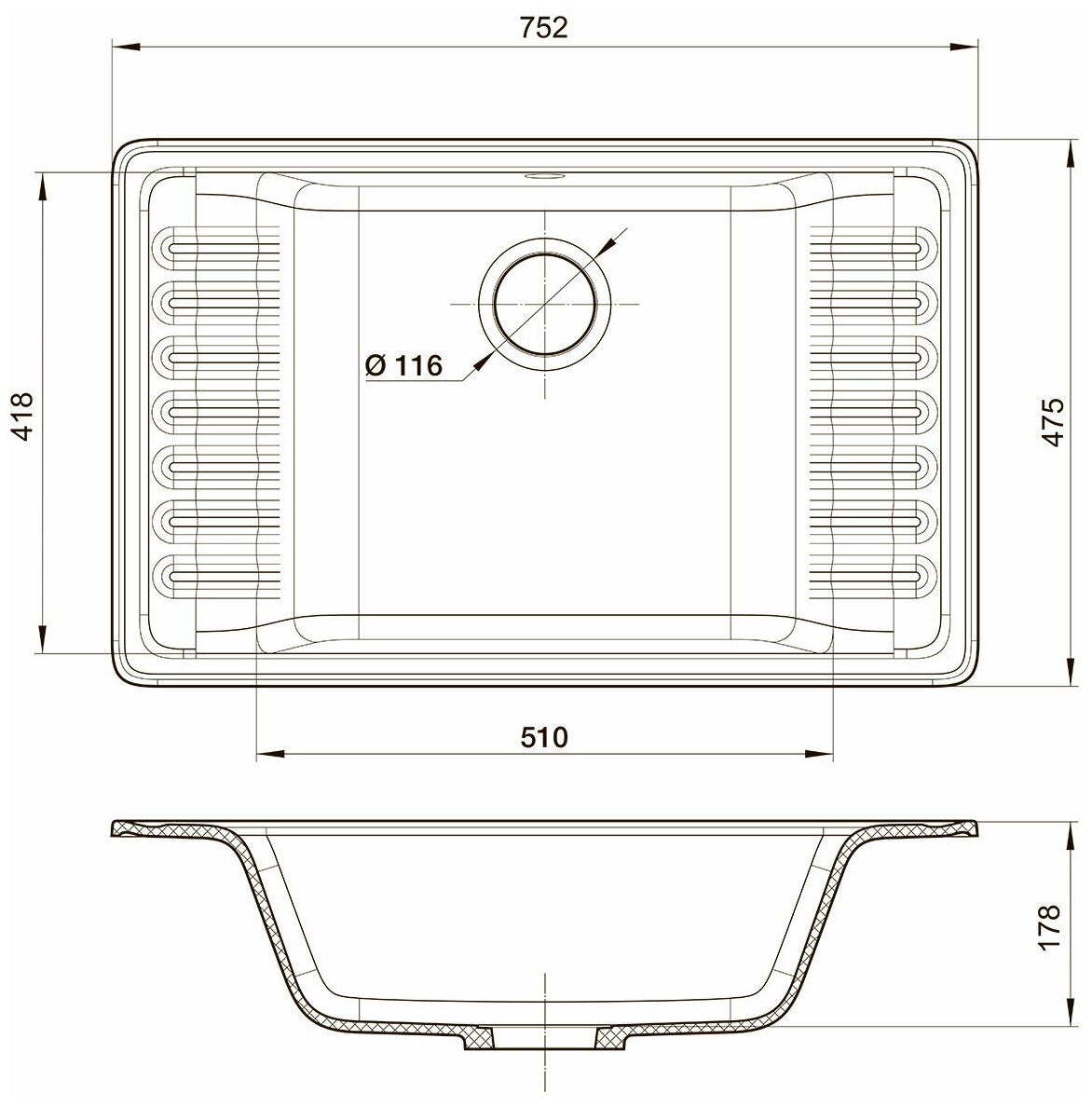 GranFest QUARZ Мойка чаша+кр 752*475 (черный) арт.GF-ZW-