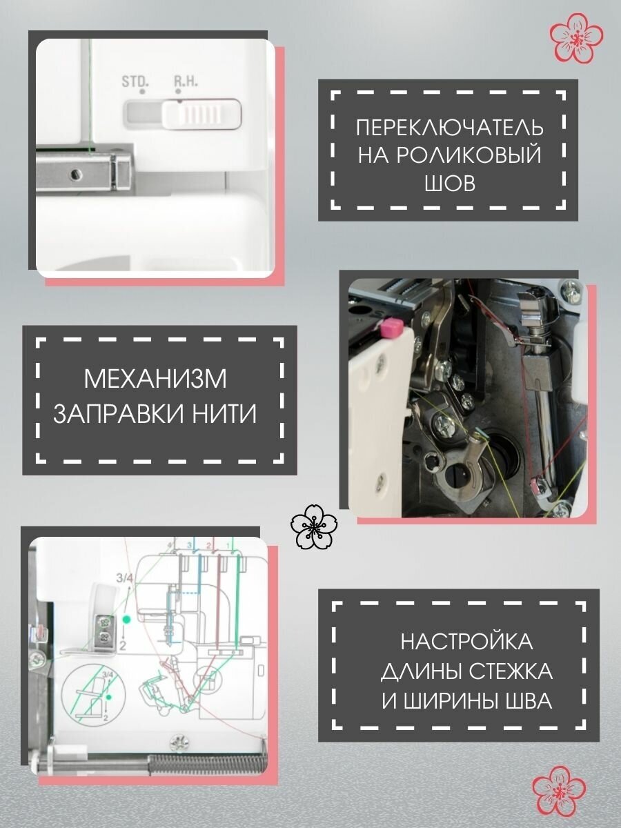 | Дополнительные функции | отключение ножа, регулировка ширины обреза ткани, заправщик нижнего петлителя, дифференциальная подача, регулировка прижима ткани |