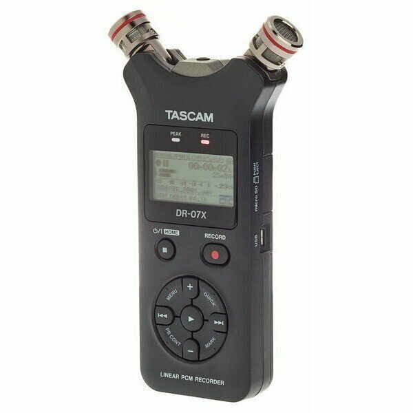 Tascam DR-07X портативный PCM стерео рекордер с встроенными микрофонами, русское меню, WAV/MP3, WAV: 44.1/48/96 kHz, 16/24 bit, MP3: 44.1/48 kHz, 32/64/96/128/192/256/320 kbit/s, габариты 90 × 158 × 26 мм, вес без батареек 130 гр.