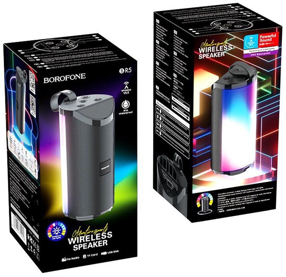 Портативная колонка Borofone BR5 Adventure Sports, 1200мАч, 2 диинамика 5W, с подсветкой, BT 5.0, AUX, microSD, USB, FM, серая