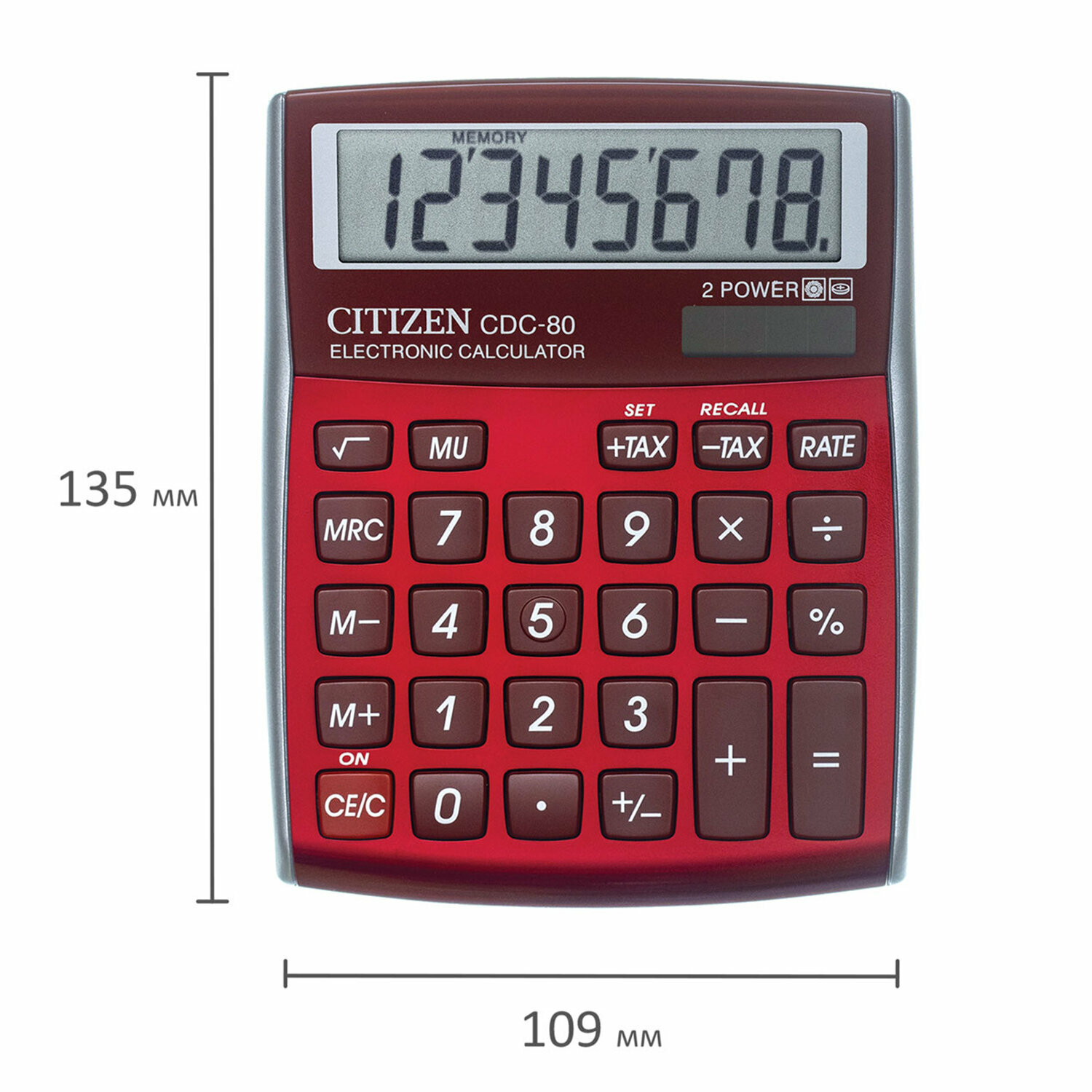 Калькулятор настольный Citizen CDC-80RDWB, 8-разрядный, 108 х 135 х 24 мм, 2-е питание, красный