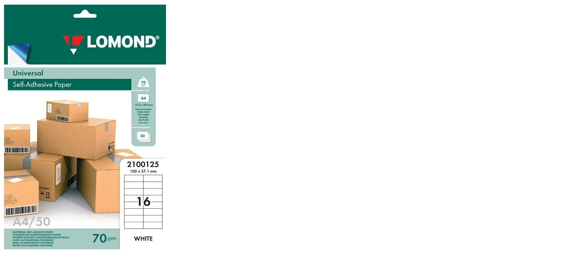 Бумага самоклеящаяся А4 50л. Lomond, белая, 16 фр. (105*37,1), 70г/м2 ( Артикул 080590 )