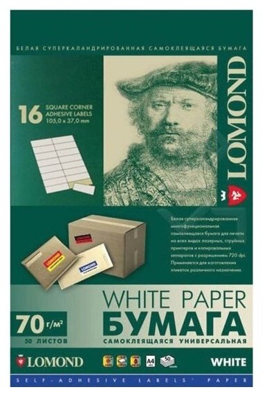Самоклеящаяся бумага Lomond A4, белая, 16 делений (105 x 37 мм), 70 г/м2, для этикеток, 50 листов (2100125)