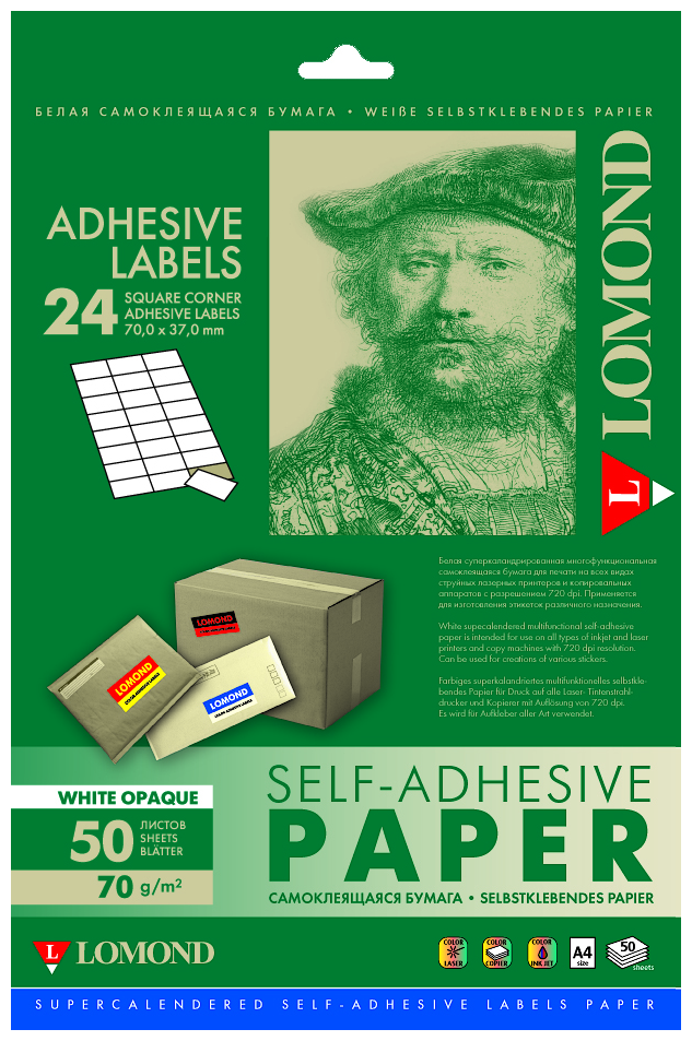 24 деления (64,0мм х 33,4мм) самоклеющаяся бумага, 70 г/м, А4, 50 листов, Lomond 2100175