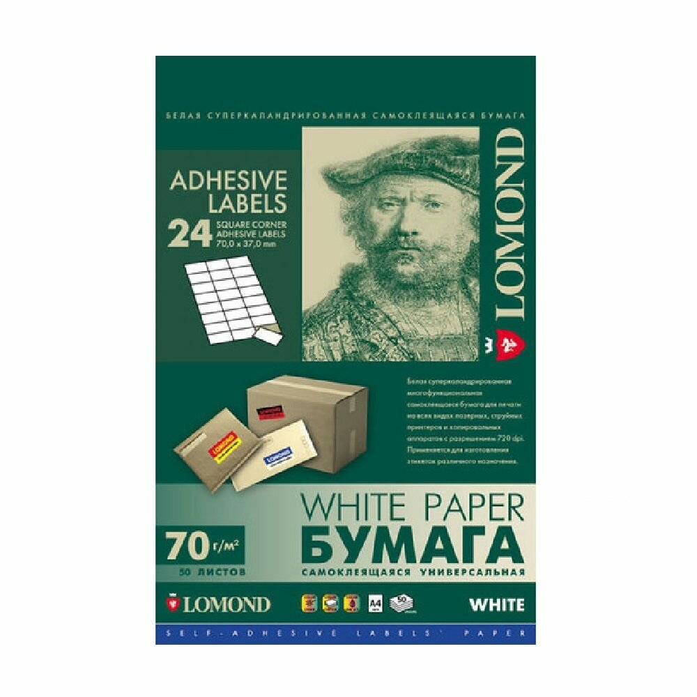 Самоклеящаяся бумага Lomond A4, белая, 24 деления (70 x 37 мм), 70 г/м2, для этикеток, 50 листов (2100165)