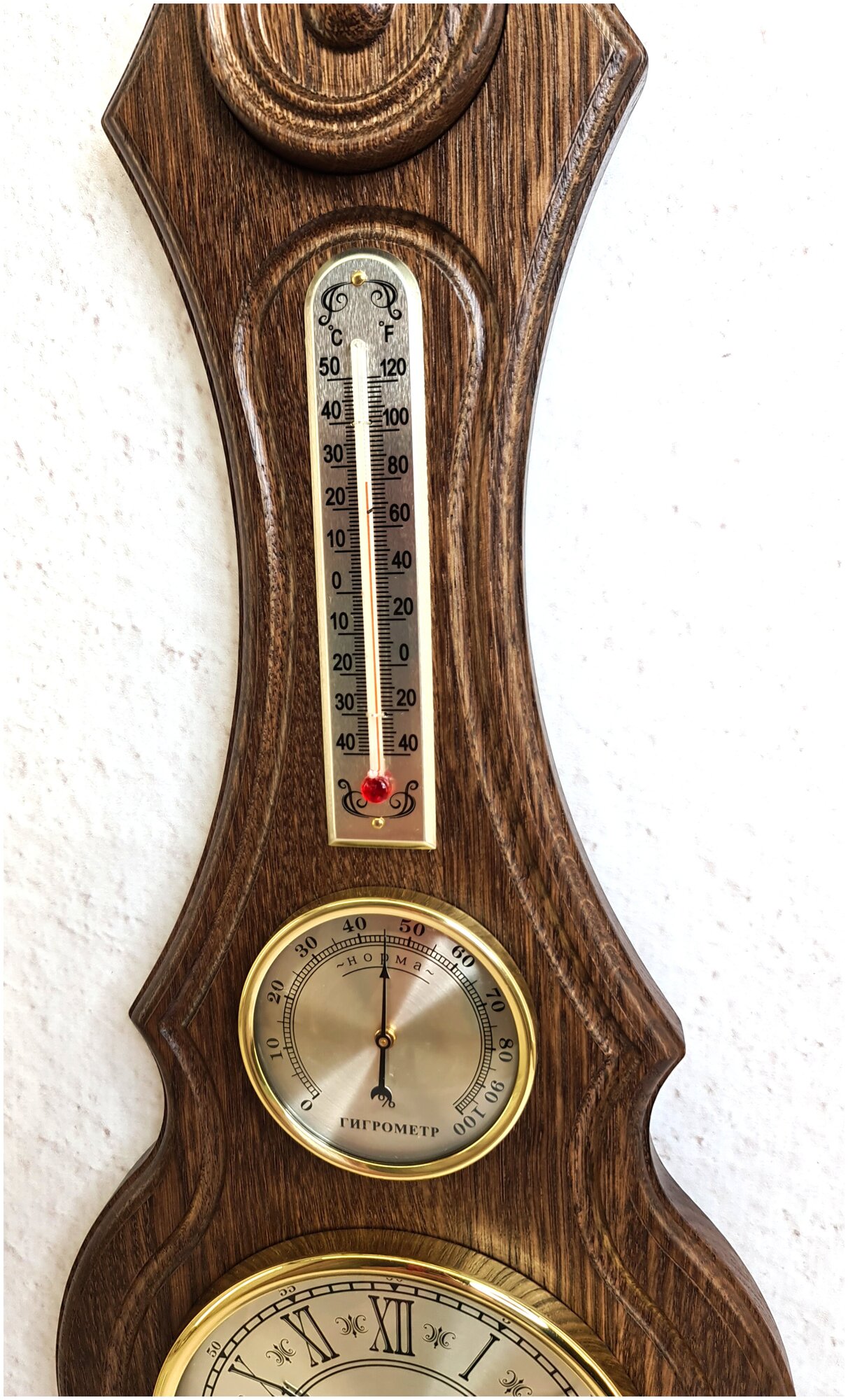 Метеостанция настенная с часами деревянная механическая домашняя барометр гигрометр термометр смич БМ75 массив дерева размер 20х61х4см