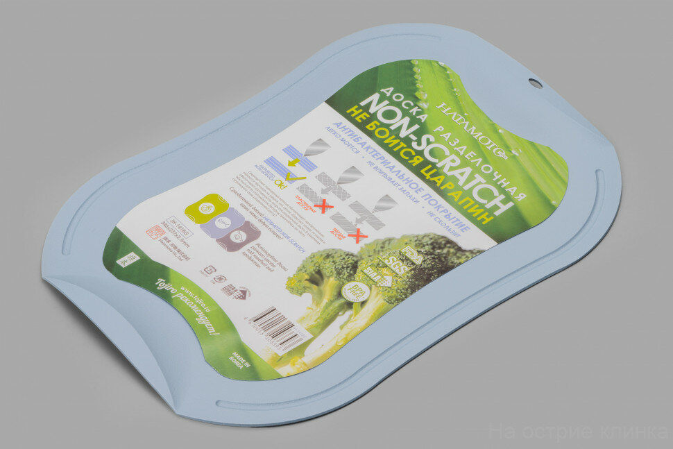 | Плюсы: | Гибкая, по периметру есть желобок, что позволяет собираться жидкости при нарезке сочных продуктов. |